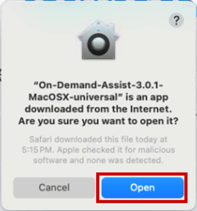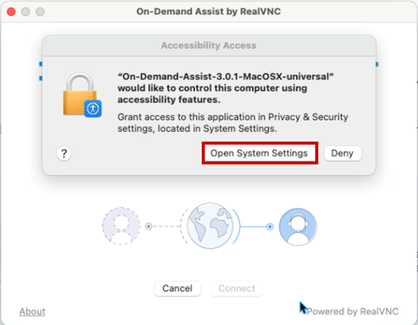 After running the On Demand Assist executable, you will see a MacOS prompt appear. Please click the Open System Settings button.