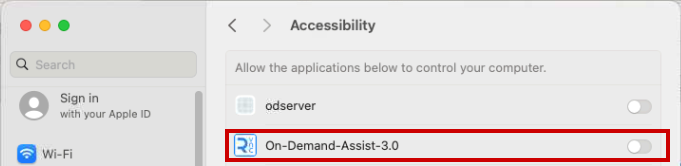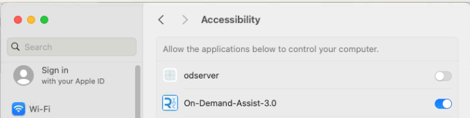 It will take you to the System Settings | Privacy and Security | Accessibility. Please toggle on the On-Demand-Assist-3.0 and the odserver.