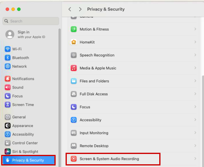 If you see this prompt, click Open System Settings and go to Screen and System Audio Recording.