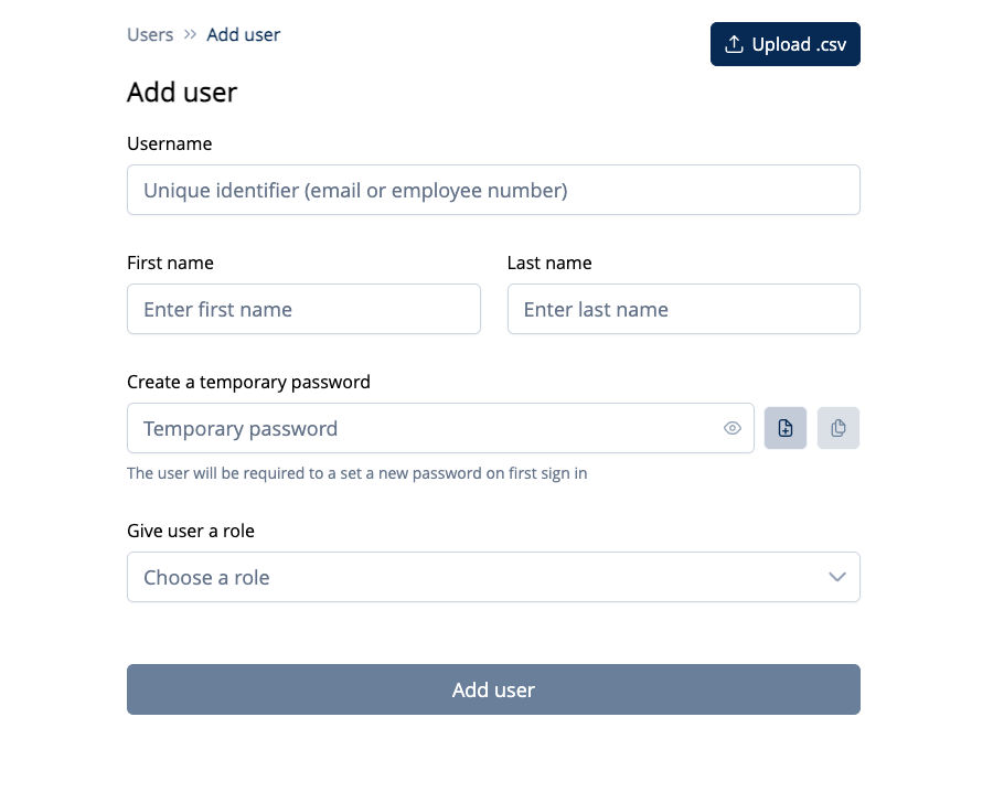 Upload a correctly formatted .csv file (a template can be downloaded from this screen) by clicking on the "Select file" button, and then click "Create Users".