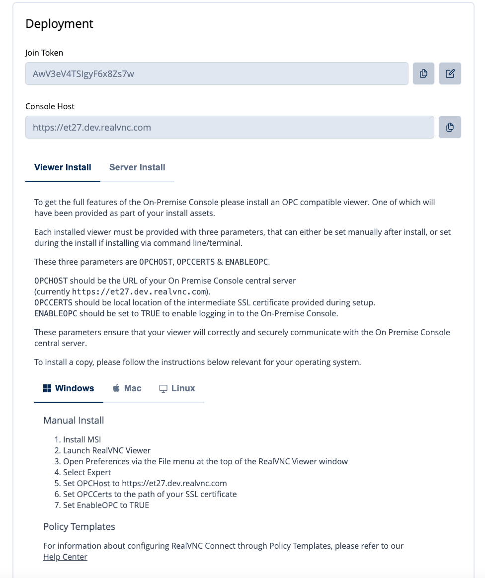 Join Token - This is used when first configuring a RealVNC Server to join a deployed environment. The Join Token can be found and edited within the Deployment section of the On-Prem Management Console.