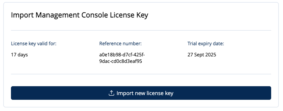 Within the On-Prem Management Console, Administrators can update their license as part of the renewal process. Any new license, either to extend the licensed time period or to change the number of provisioned licenses, can be imported by clicking ‘Import new license key’: