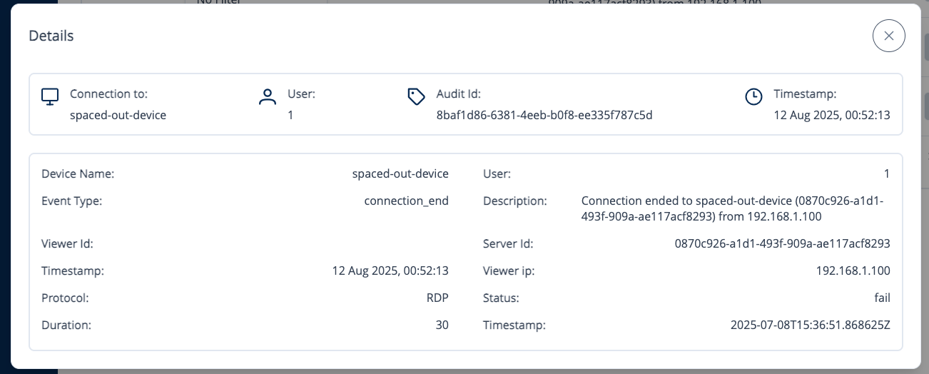 Within the Audit section of the On-Prem Management Console, Administrators can view detailed audit data. Once they have found the audit record in question, clicking on the ‘Eye’ Icon will open a pop-up which will provide the full details of the audit record: