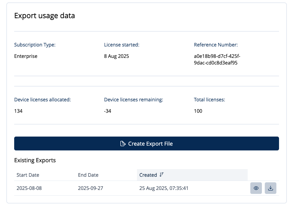 Within the On-Prem Management Console, Administrators can export Usage data to be provided to RealVNC as part of the renewal process. This data is encrypted to ensure the accuracy and confidentiality of any data. It doesn’t track activity or usage within any sessions, just high-level overview usage data to enable RealVNC to ensure that the right package can be provided at renewal and to prevent against license abuse.