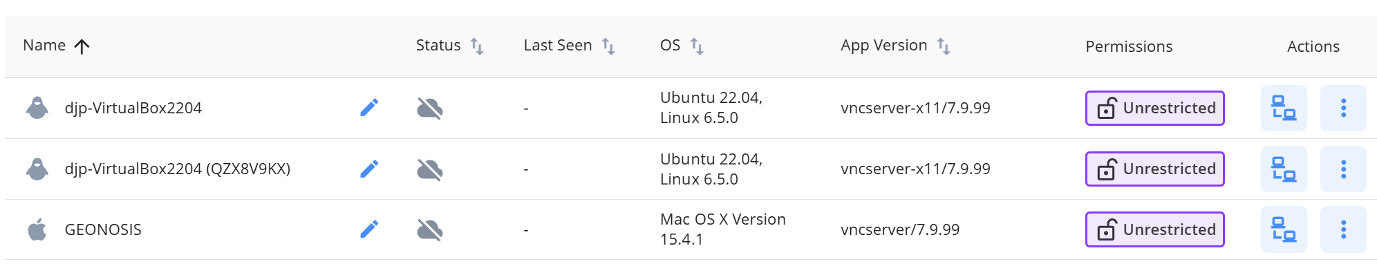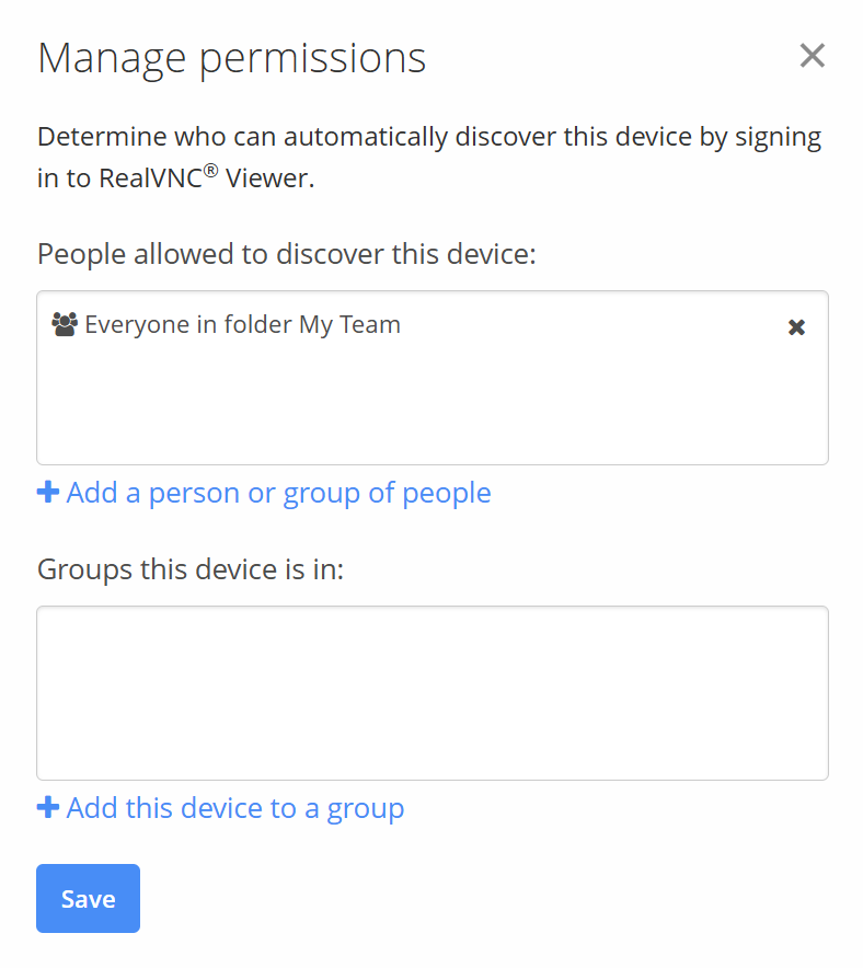 You can divide responsibility for remote devices among the people in your team by assigning discovery permissions on the Device List page of the RealVNC Connect Portal.