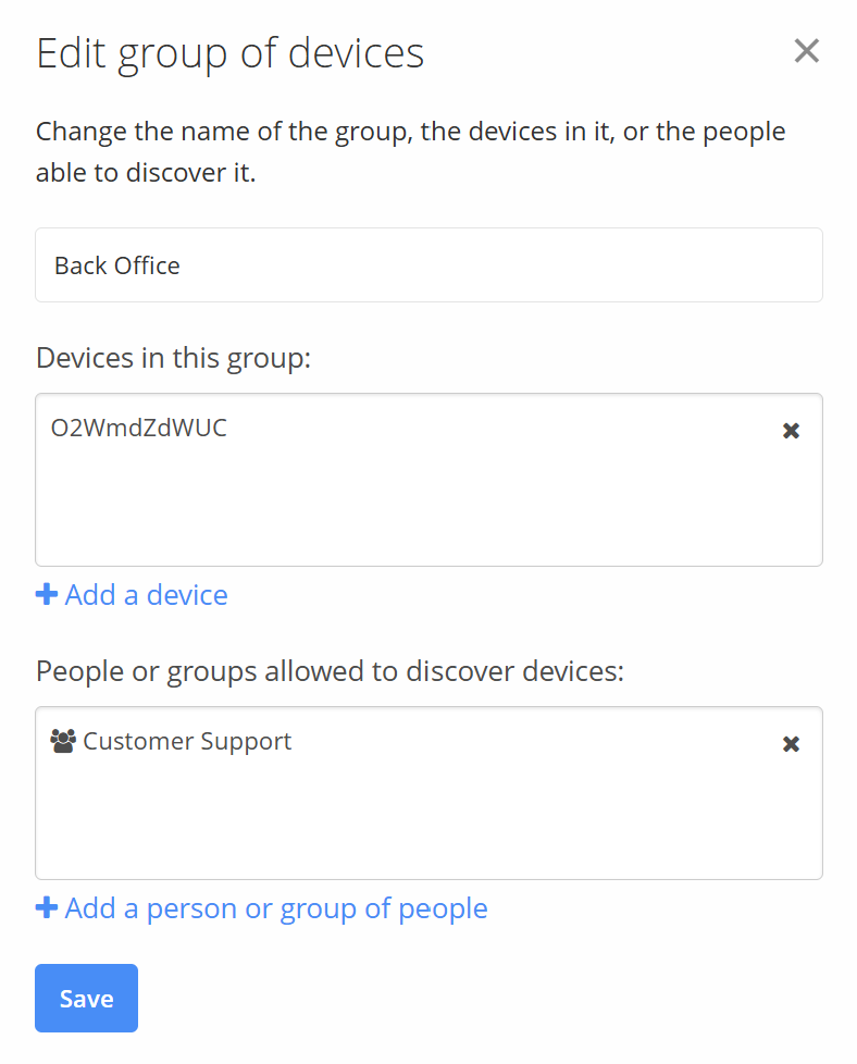 In the Edit group of devices dialog, select + Add a person or group of people to explicitly name people, or groups of people, that should have access: