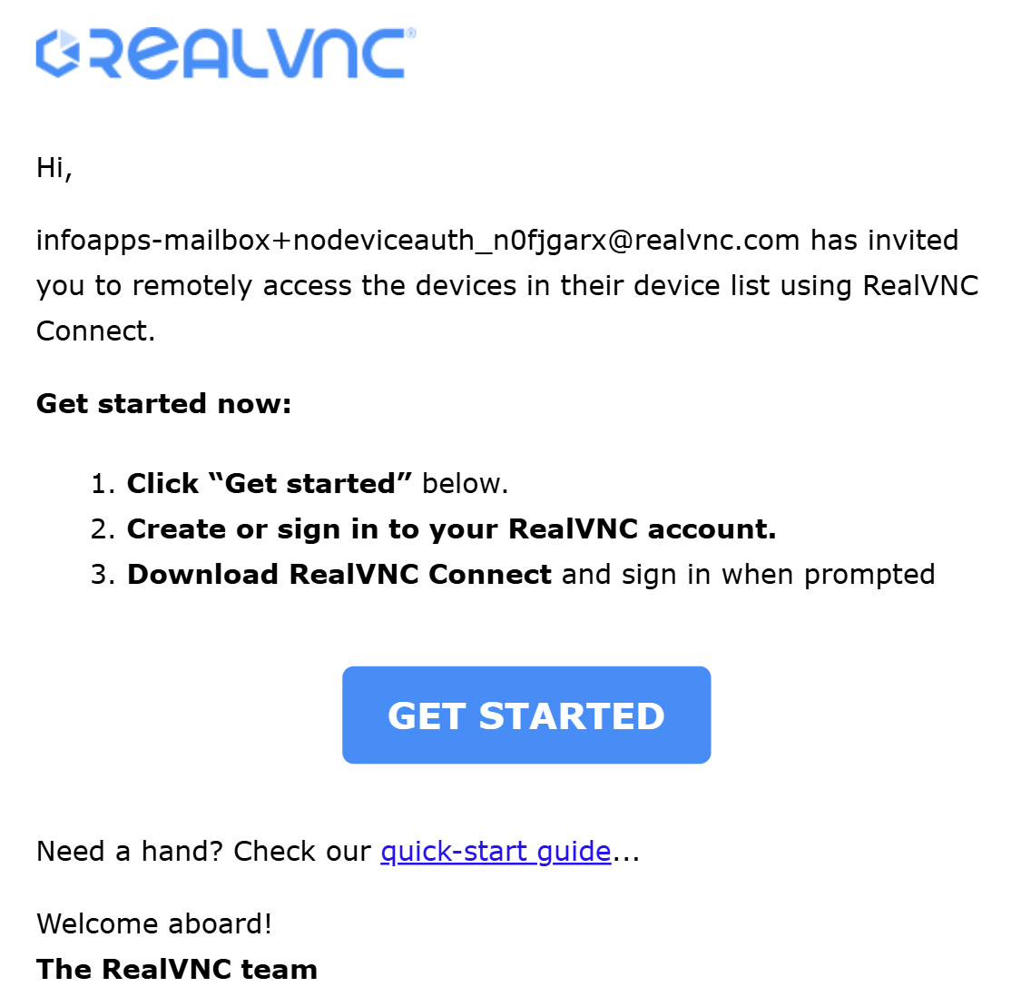 1. You will receive an email from RealVNC with your invitation to the Team. Click the Join Team button in the email.