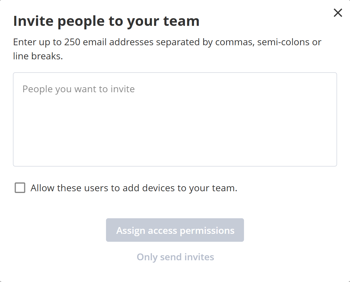 3. Enter the email address of the person you'd like to invite to your Team. Optionally assign access permissions via a Group (depending on your subscription), then click 'send invites'.