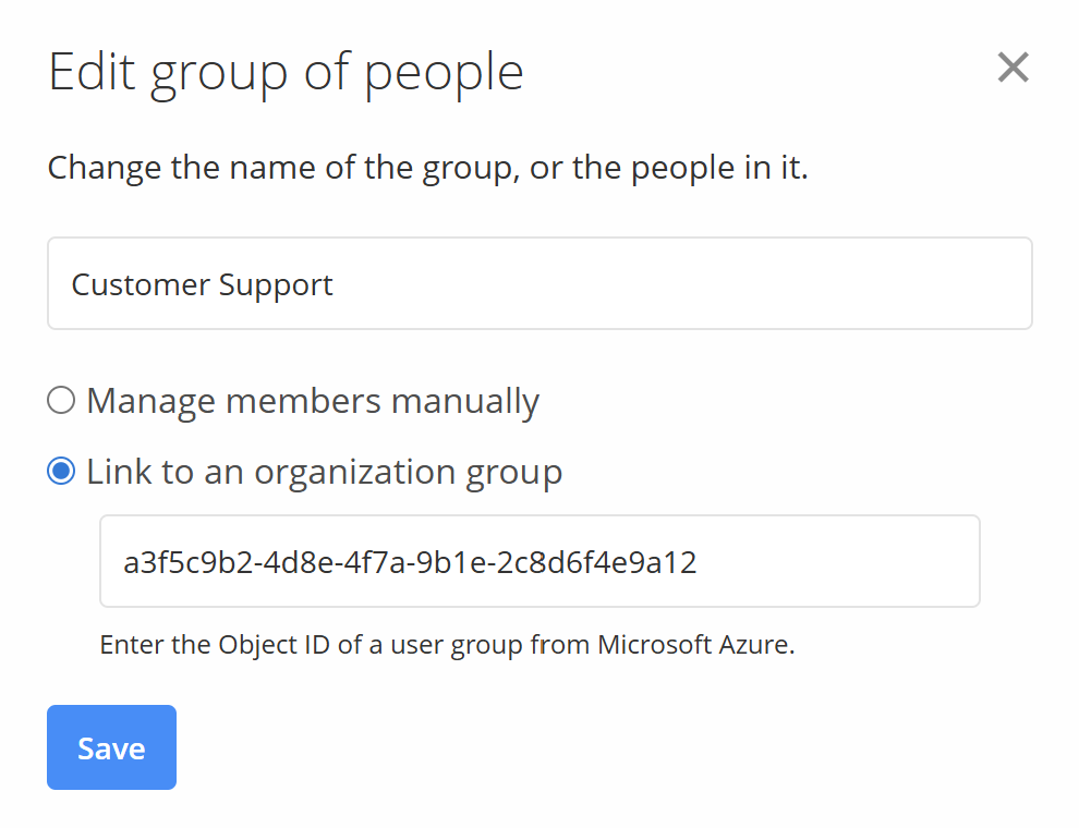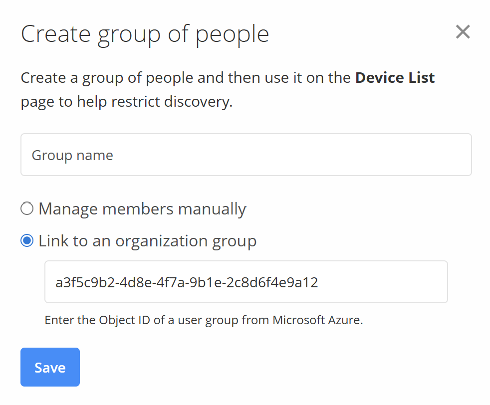 7. If creating a new group, enter the name of the group. For new and existing groups, select Link to an organization group and enter the Entra ID/Azure AD group's object ID. Click Save