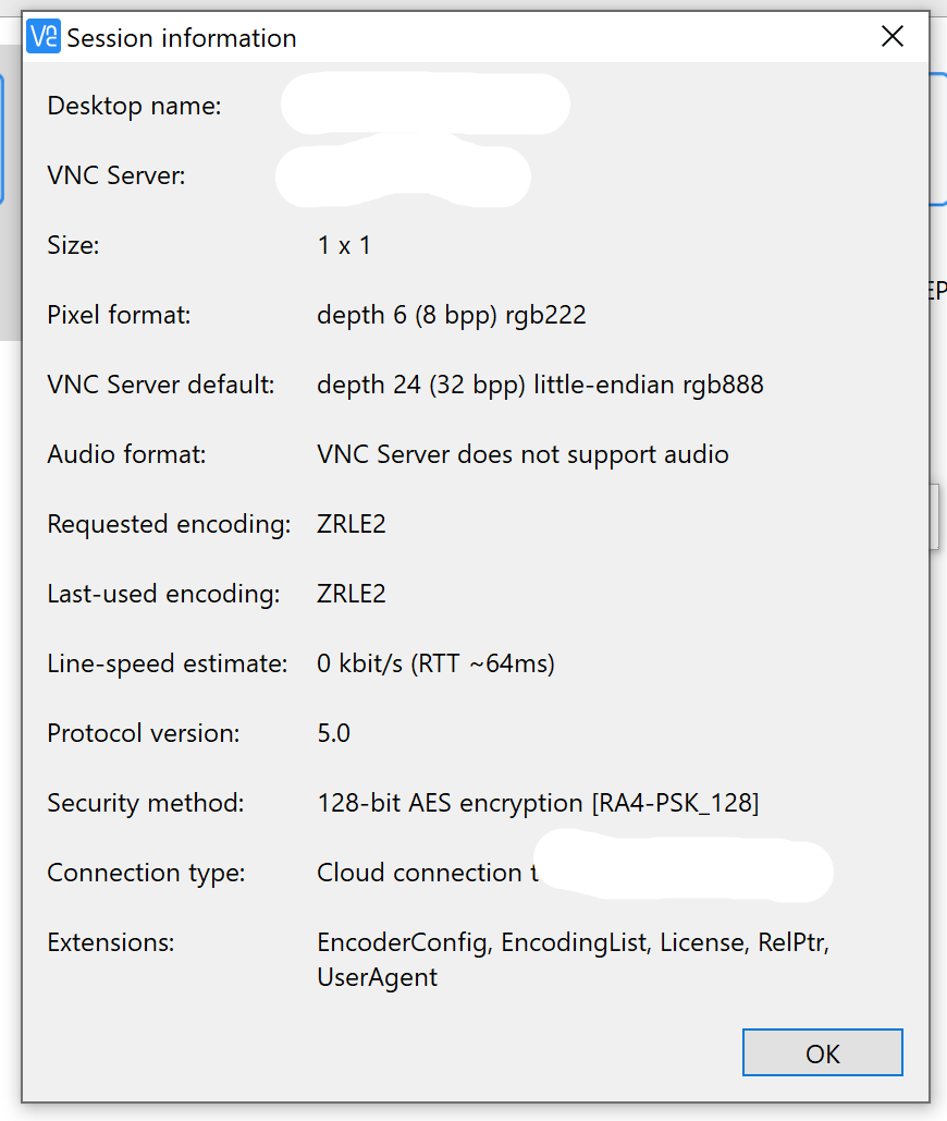 The "Size:" settings in the Session Information for one of my remote computers somehow got changed to "1 x 1" which makes it impossible to use. All the other computers in my group have normal "Size:" settings - ie..."2896 x 1626"